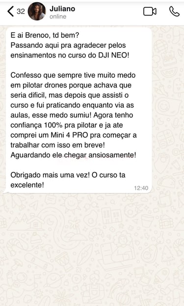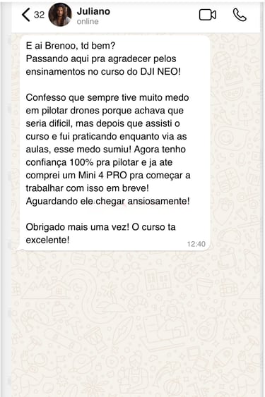 O meu curso é o único que oferece uma formação completa, permitindo que você pilote o DJI NEO com confiança e, posteriormente, outros modelos como o DJI Mini 3 e DJI Mini 4. Ele é a porta de entrada para um universo repleto de possibilidades.